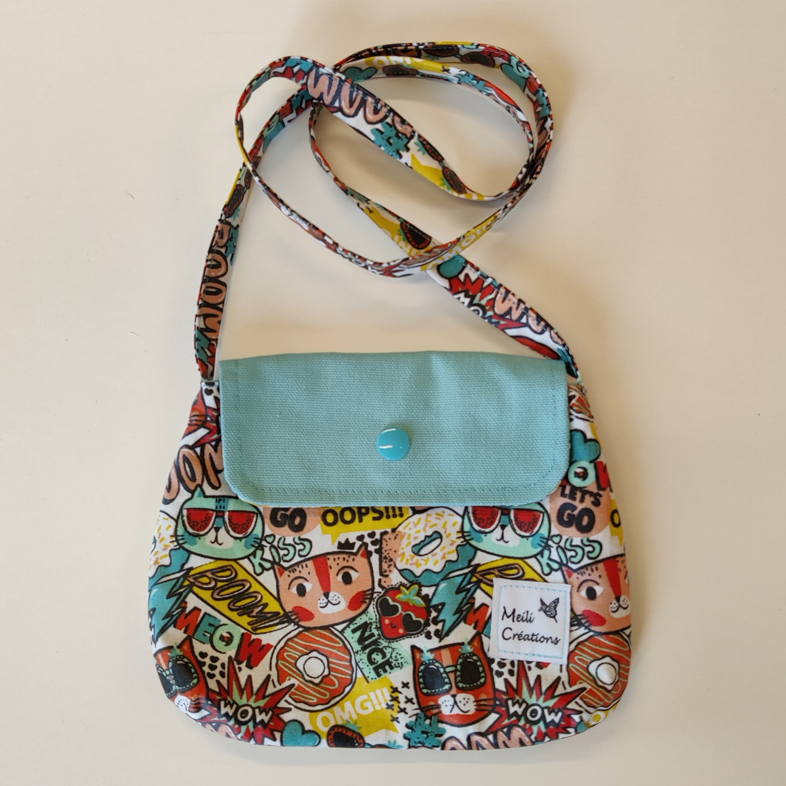 Apportez une touche de style, de praticité et d’authenticité artisanale au quotidien de votre enfant avec le Sac Chat. Réalisé en coton enduit de qualité, il combine résistance, légèreté et facilité d’entretien, pour un accessoire pratique et durable. Son rabat de couleur turquoise avec pression ajoute une note lumineuse et joyeuse, parfaite pour les enfants.